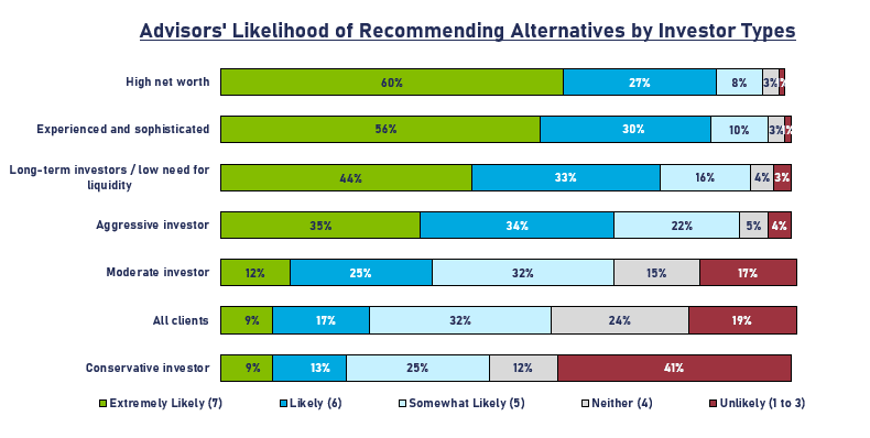 Despite improvements in choice and access, alternatives are still targeted toward traditional clients, including HNW clients, followed by experienced and sophisticated clients and long-term investors with low liquidity needs. However, the likelihood of recommending alternatives across a larger portion of an advisor’s client base is low to moderate, with 37% of advisors likely or extremely likely to recommend alternatives to their moderate investor clients and 26% for all clients.