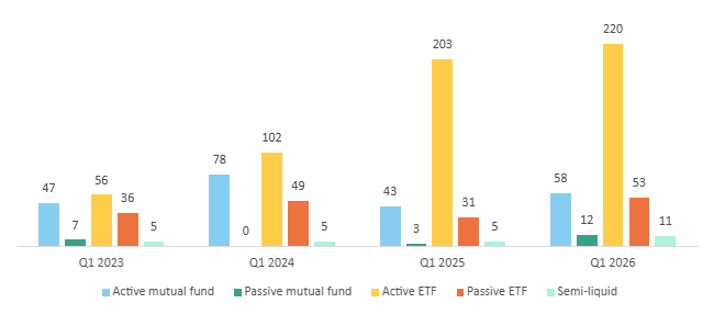 Active ETFs continued to anchor launch activity. The quarter saw 220 launches, slightly ahead of Q1 2025’s pace. Considering that 2025 as a whole saw nearly 1,000 new active ETFs, 2026 stands to be another year of extremely high product development. Active ETF issuance has settled into a structurally elevated range, highlighting how fully the wrapper has been integrated into managers’ core product strategies.