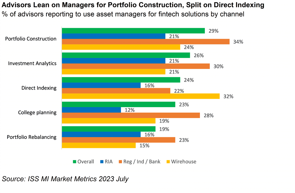 Portfolio construction and direct indexing were other fields in which asset managers saw high uptake of their software, as 29% of advisors reported relying on them for the former task and 24% for the latter. Vanguard proved to be the most popular manager when it came to direct indexing, with one in five advisors reporting their platform as the best, though other managers found success within specific channels. Wirehouse advisors—the most enthusiastic adopters of direct indexing relative to other distribution channels—reported Morgan Stanley as their preferred platform. Among respondents in the RIA channel, which reported the lowest use of direct indexing solutions, Schwab tied with Vanguard; 21% of surveyed RIAs identifying them as their preferred managers for direct indexing. Blackrock, which offers portfolio construction services through its Aladdin software suite, was reported as the most popular manager by all three channel segments for the task, with 1 in 4 advisors reporting them as their preferred provider of portfolio construction software.