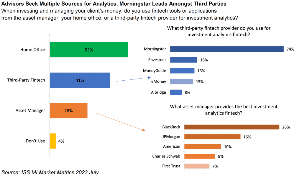 In contrast, investment analytics proved a more competitive ground for managers and third-party firms alike, with 26% of advisors reporting to use asset manager software and 41% reporting to use third-party software for this purpose. Among asset managers, BlackRock served as the most popular provider of investment analytics, capturing 26% of the asset manager market share, nearly 10 points ahead of the second-place manager, JPMorgan. Of the 41% of advisors that use third-party providers for investment analytics, advisors reported a rather lopsided answer, with 74% mentioning Morningstar, over four times more frequently than the next most cited firm, Envestnet (18%). While the third-party market specifically is concentrated, it remains only a fraction of the total market. Over two-thirds of advisors reported not using Morningstar’s analytics at all.