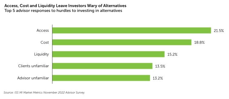 In addition to developments in the liquid alternative space, private market alternatives continue to attract heightened attention, driven both by investor demand and new avenues of access to alternatives. While private alternatives face significant regulatory headwinds limiting access to individual investors, they have nevertheless continued to draw considerable interest A mid-2022 survey conducted by ISS MI Market Metrics showed that the number of advisors who reported investing client dollars in private alternatives rising three percentage points (from 39% to 42%) in just six months, with non-traded REITs, private equity, private credit, and hedge funds all seeing increased investments.