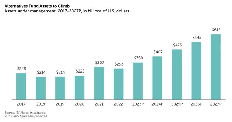 We expect demand will remain strong in the years ahead. ISS MI’s 2023-2027 outlook, detailed in the recently published State of the Market: Future of Retail Products report, projects nearly $240 billion in alternative fund flows over five years, a 12% annual organic growth rate. On the back of brisk sales, AUM is projected to rise 15% annually to almost $620 billion (see the chart below).