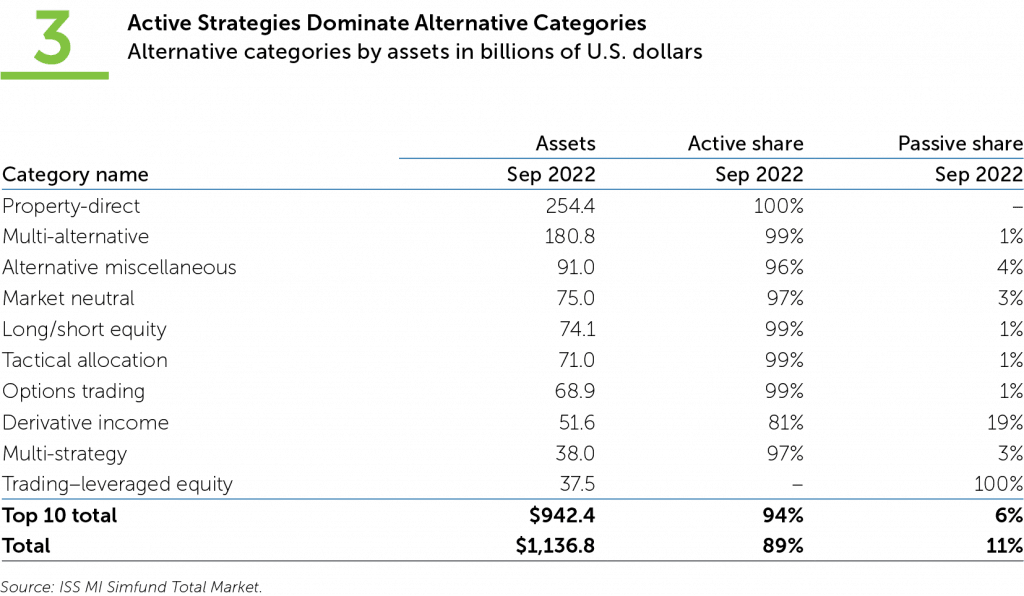 The largest alternative category in the data set, Property – direct, involves illiquid, directly-held real estate holdings. However, many alternative strategies in more retail-oriented vehicles will invest in public securities but depart from long-only strategies in employing greater shorting, hedging, or other less conventional methods. Multi-alternative, the second-largest category in the dataset and the largest alternative strategy held in open-end funds, encompasses products that employ a combination of alternative strategies, often tactically rotating between them. (Figure 3 displays the 10 largest alternative categories and the composition of active and passive funds in each category.)