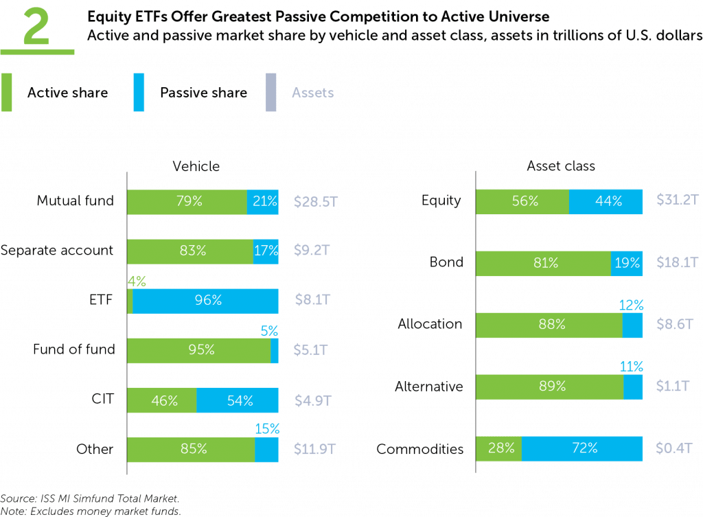 Active strategies remain the bulk of global assets in investment vehicles and will continue to drive revenues for the industry for the foreseeable future. The increasing market share of heavily passive ETFs have increased pressure on many managers, encouraging them to engage in their own price cuts or merger and acquisitions activity in order to remain competitive. Alternative assets’ heavy representation in active strategies (see Figure 2) can help enhance their appeal to players under pressure. Alternative strategies are admittedly a more niche market by definition and will not supplant traditional strategies as the core of many investors’ portfolios. Fortunately, they will likely prove more resilient to passive competition.