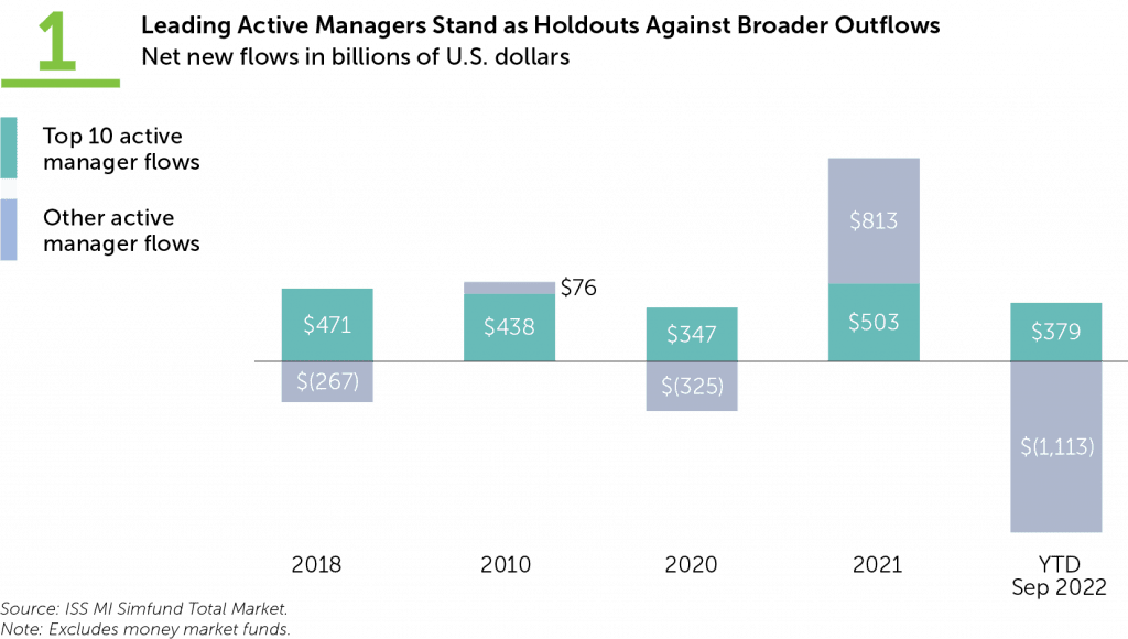 Previous entries within this series have explored the issue of market concentration through the lens of assets held by leading players. While a number of vehicles have recorded a greater dispersion in assets in previous years, flows in any given year can be quite concentrated. Top players may gather the bulk of net flows, leaving little for the rest of the universe. This can be particularly drastic within active markets, where leading managers may ultimately gather the entirety of positive net flows. Over the past three years ending in September 2022, the top 10 inflow-gathering active managers brought in 97.8% of the $767.1 billion in long-term flows garnered over that period. Figure 1 displays the aggregate net flows gathered by the 10 best-selling active managers in each year compared to the rest of the active universe.