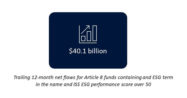 A label may of course only be as deep as the paper it is written on. A better bellwether of ESG funds may be the ESG metrics of their portfolios. Layer on ISS ESG’s fund performance score and it becomes apparent that funds with an ISS ESG performance score over 50, which puts them in “Prime” status territory, had the sales advantage over the past 12 months. Article 8 funds containing as ESG label and an ISS ESG performance score of over 50 attracted $40.1 billion in net flows. Meanwhile, Article 8 funds with a performance score of over 50 but without an ESG label lost $27 billion in flows. While not spectacular, it is still far better than the over $170 billion lost in flows by Article 8 funds without an ESG label and either without an ESG score or a score of under 50.