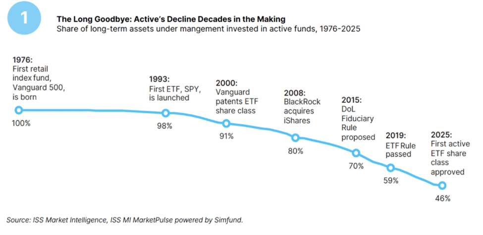 Further, the report highlights the potential implications for active management, while active’s share of long‑term assets has fallen from 100 percent in 1976 to 46 percent in 2025, as shown in the chart above. Despite this decline, the report emphasizes that renewal is possible for firms willing to adapt to evolving customer needs, modern product structures, and shifting distribution realities.