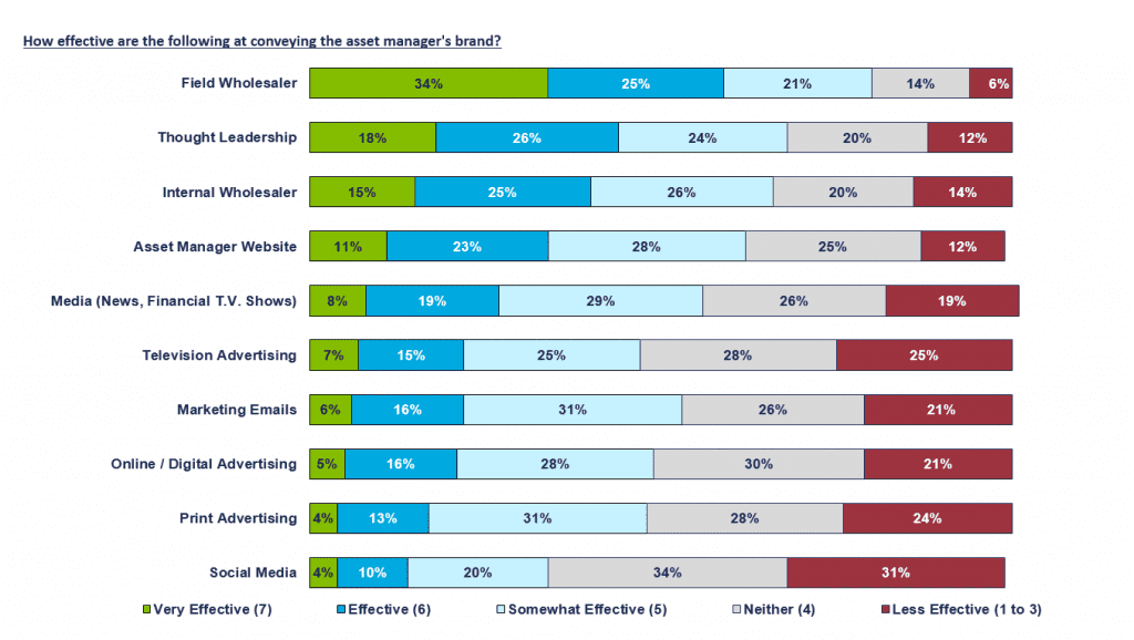 Advisors generally believe that the field wholesaler is the most effective at conveying an asset manager’s brand