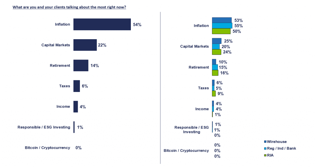There is no shortage of topics for advisors to discuss with clients at present. More than half of advisors (54%) stated the inflation was the topic coming up most frequently in discussions with clients. Fewer advisors (22%) are currently focusing client conversations on capital markets. Given the industry buzz around direct indexing and the benefits of tax loss harvesting, one might expect that taxes would rank much higher, yet only 6% of advisors are talking with clients about taxes more than other subjects.
