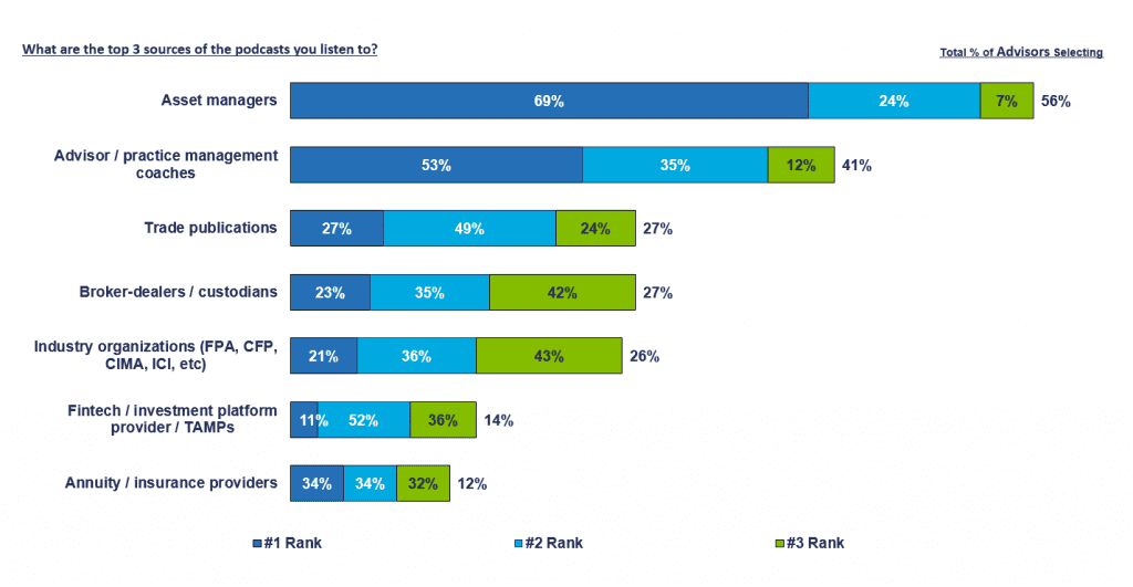 To capture and sustain advisors’ attention, asset managers must craft the right message, at the right time, to the right audience, and deliver it through the right medium. One of those communication mediums is podcasts. Nearly 40% of advisors listen to podcasts, a relatively high percentage in this era of fractured attention. When asked which asset managers have the best podcasts, advisors selected American Funds, JPMorgan, and Blackrock as the top three providers.