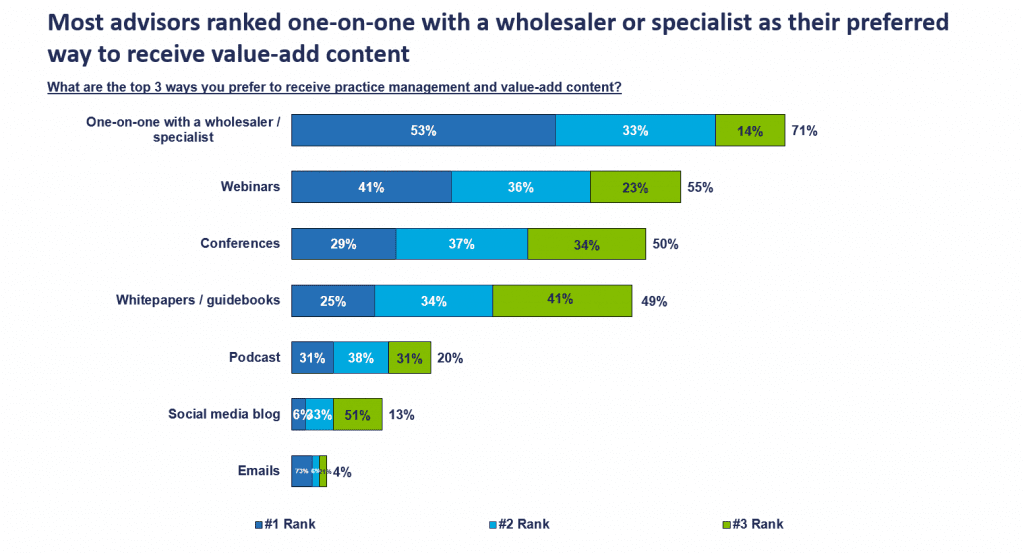 In an era when it is exceedingly difficult to connect with advisors over the phone or in person, value-add can open doors to a conversation. More than 70% of surveyed advisors overall prefer to receive value-add materials from a one-on-one interaction with their wholesaler or specialists rather than digital or other means including webinars, conferences, emails, and white papers. RIAs are the exception, with 74% preferring to receive practice management via a webinar.