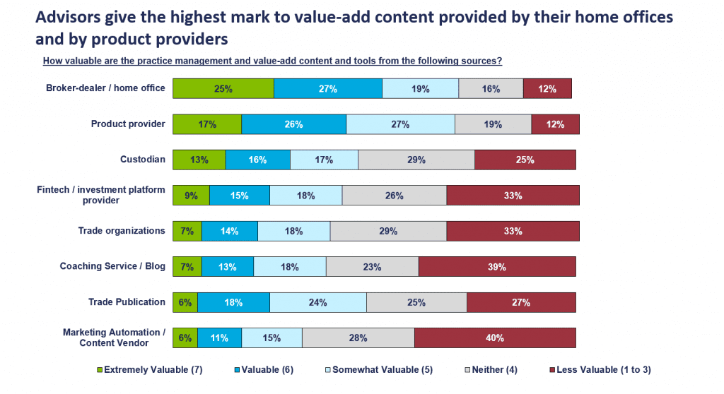 Asset managers aren’t the only ones offering value-add support to advisors. Indeed, 25% of overall advisors consider broker-dealer/home office value-add content to be extremely valuable compared to 17% of overall advisors that deem providers value-add content to be extremely valuable. Custodians enjoy high marks for their value-add content, with 23% of RIAs rating their value-add support as extremely valuable. When advisors were asked which firms are best at providing value-add and practice management content, Morningstar, Schwab, Envestnet and Salesforce landed in the top ten firms cited.