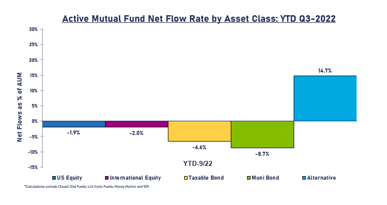 The current economic and market volatility bodes well for using alternatives in a client’s portfolio and has been a bright spot for mutual fund managers. As of the end of Q3 2022, alternatives were the only mutual fund asset class with positive YTD net flows of $32 billion and net rate flow rate of 14.7%. While advisors are investing more dollars in alternatives, market opportunity and outlook still face challenges.