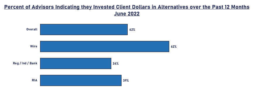 A recently completed ISS Market Intelligence advisor survey of 810 financial advisors finds they are interested but cautious in using alternatives, increasing slightly from 39 percent in December of 2021 to 42 percent in June of 2022. Usage is higher among Wirehouse advisors at 62%, driven by a greater focus on affluent clients and strong home office/field investment support, compared to RIAs at 43% and independent broker-dealers, regional, and banks at 34%, and is expected to continue to increase.