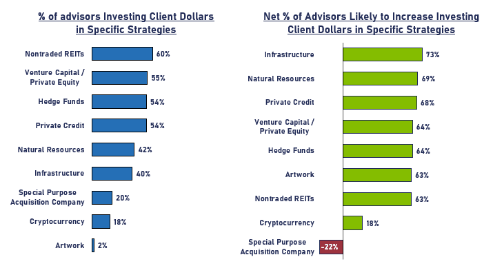 Non-traded REITs, private equity, hedge funds, and private credit top the strategies among advisors currently using alternatives, but infrastructure and natural resources take a slight lead as strategies advisors are likely to increase investment in.