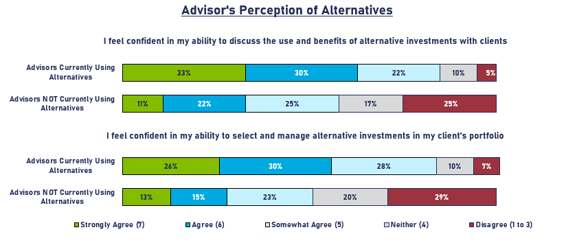 For advisors currently using alternatives, attitudes and perspectives on alternatives are favorable but somewhat mixed. One-third strongly agree they are confident in discussing alternatives with clients, and advisors not currently using alternatives have less conviction around these issues. Only 26% of advisors who use alternatives strongly agree they feel confident selecting and managing alternatives in their client’s portfolios, and only 13% for non-users.