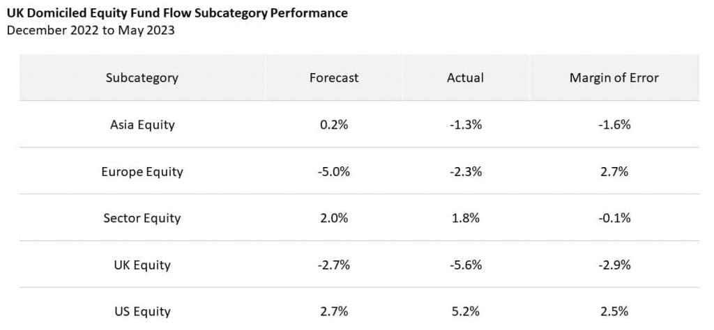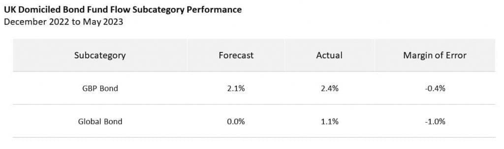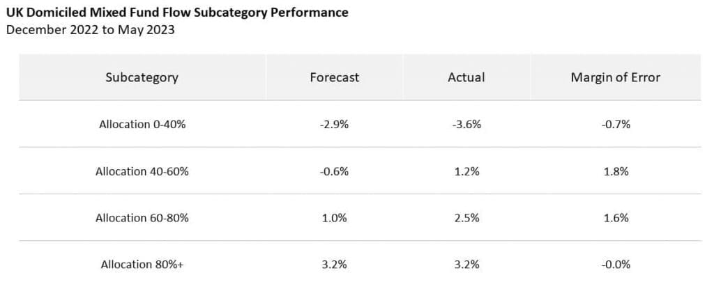 Once again, mixed funds led the way again in terms of net flows in the trailing six months to May 2023. Our forecast, however, did not see this coming. Opposed to a realized six-month organic growth rate of 1.3%, our January forecast saw mixed funds only breaking even throughout this period. While the model accurately predicted, almost to a tee, the flows into mixed funds with an equity allocation of 80%+, the biggest miss was on funds with an equity allocation of between 40-80%. This miss is likely related to the fact that rises in interest rates have impacted the relative attractiveness of bond and equity investments, with bonds becoming more in favour; mixed funds with a lower gearing of equity may therefore find renewed interest.