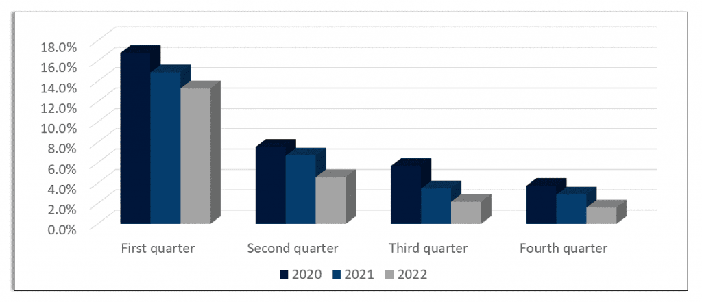The turbulence of 2022, however, does appear to have negatively impacted the chances of funds hitting the €100 million AUM mark in the first four quarters after launch, at least in the near-term. Compared to 2020 and 2021, a new fund’s chance of hitting the €100 million mark in the first four quarters fell significantly. The chances of the fund reaching this level of AUM in the first quarter after launch averaged 15.8% between 2020 and 2021, but only 13.3% in 2022. For quarters two to four after launch, the chances of a fund hitting the target dropped between one third to one half. Funds slow off the mark in 2022, therefore, faced a steeper hill to climb than in the previous two years.
