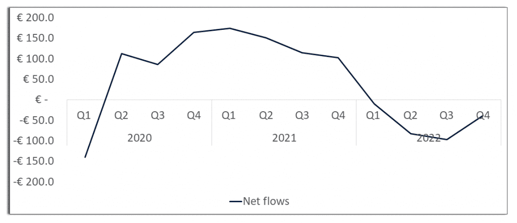 Net flows of Irish- and Luxembourg-domiciled investment funds from 2020 to 2022