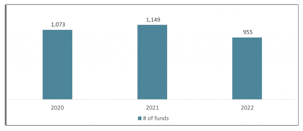 With the yo-yoing of investor sentiment, oscillating between bouts of bullishness and pessimism among investors, fund managers have not had a stable environment in which to launch funds. Fund managers, nonetheless, kept to the script, with total fund launches varying only slightly throughout the three years. 2022, a seemingly particularly challenging year in which to launch funds, saw a decline in fund launches of only 11% from 2021.