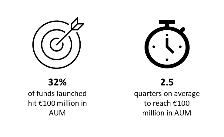 Percentage of funds launched between 2020-2022 that reached the €100 million AUM level and the number of quarters required on average to do so