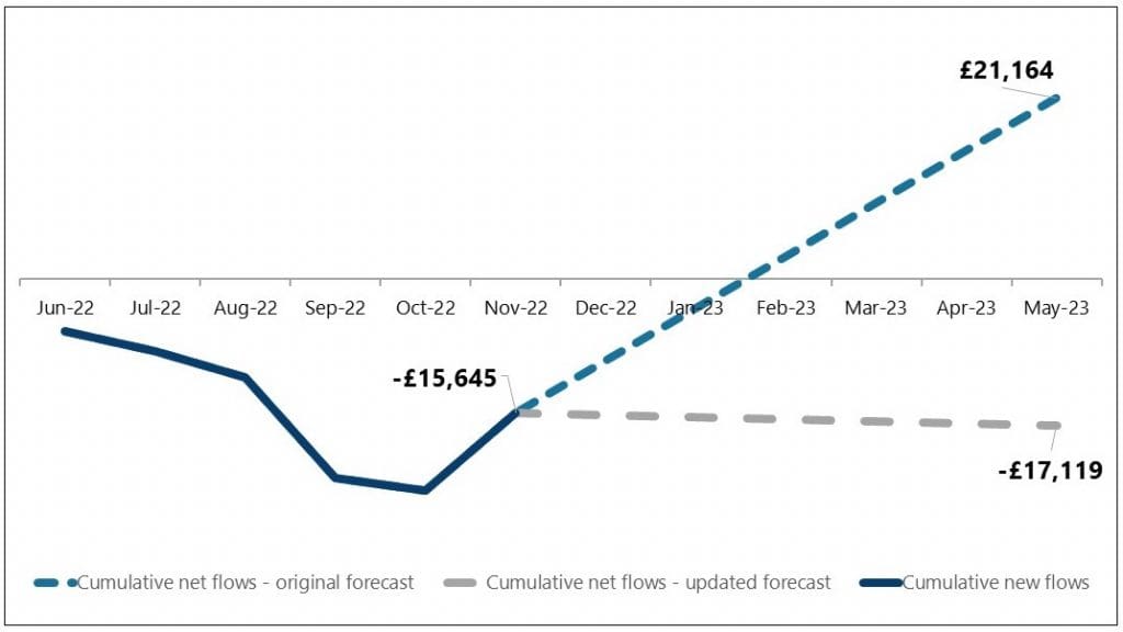 Figure 1: Six-month U.K.-domiciled fund flow forecast – original vs. updated (in millions)