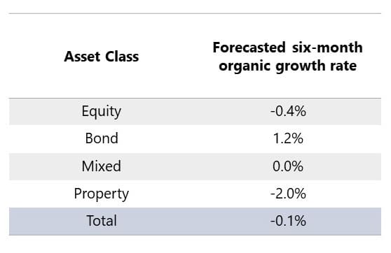The latest forecast, generated using ISS Marketing Intelligence’s Flowspring analytical tool, strongly points towards the latter scenario, forecasting net flows to stand at -0.1% over the next six months, a significant deviation from the original 12-month forecast (see Mix of Sun and Cloud), which, if it proves correct, is predicting a sharp turnaround in flows.