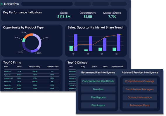 The leading provider of retirement plan and distribution intelligence, MarketPro Retirement provides an unmatched combination of retirement plan data and the advisors and firms linked to those plans.  This industry-leading distribution intelligence enables asset managers, recordkeepers and distributors to understand sales opportunities and market share at DC plans.