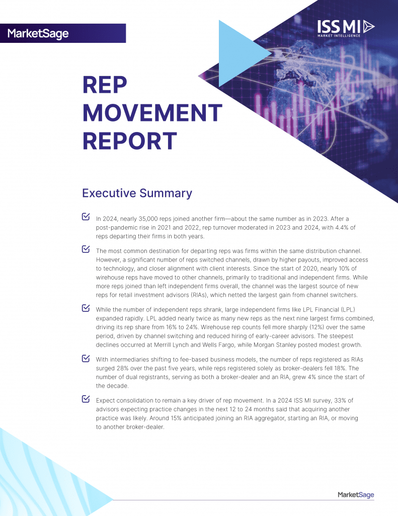 - With rules shifting to AUM fee-based business models, the number of reps registered as RIAs surged 28% since the start of the decade.